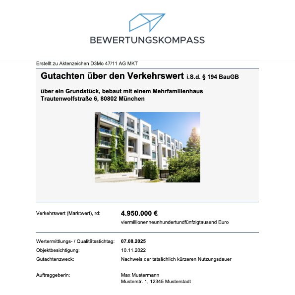 Zuerst werden von der KI alle Daten analysiert und automatisch in normierte, prüffähige Bewertungsverfahren nach ImmoWertV und BelWertV übertragen, ausgewertet und nochmals von der KI beurteilt.