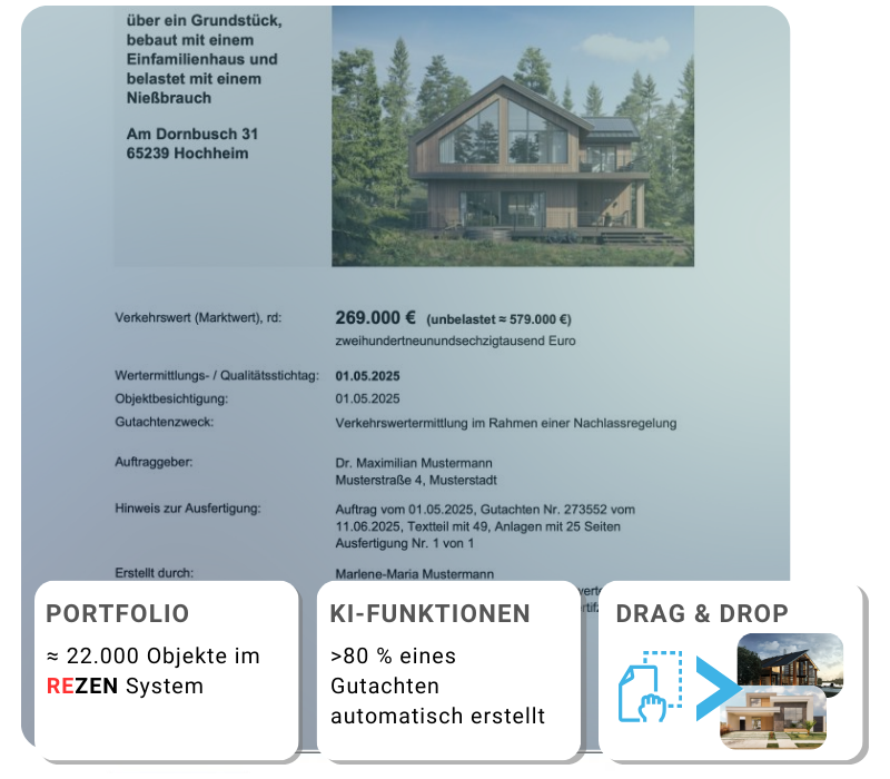 Mit Funktionen wie QES-Signatur in 20 Sekunden, automatischer E-Rechnung und kontinuierlicher Weiterentwicklung setzt REZEN Maßstäbe im Gutachtermarkt. Institutionelle Auftraggeber erhalten damit nicht nur schnelle Ergebnisse, sondern auch langfristige Investitionssicherheit.